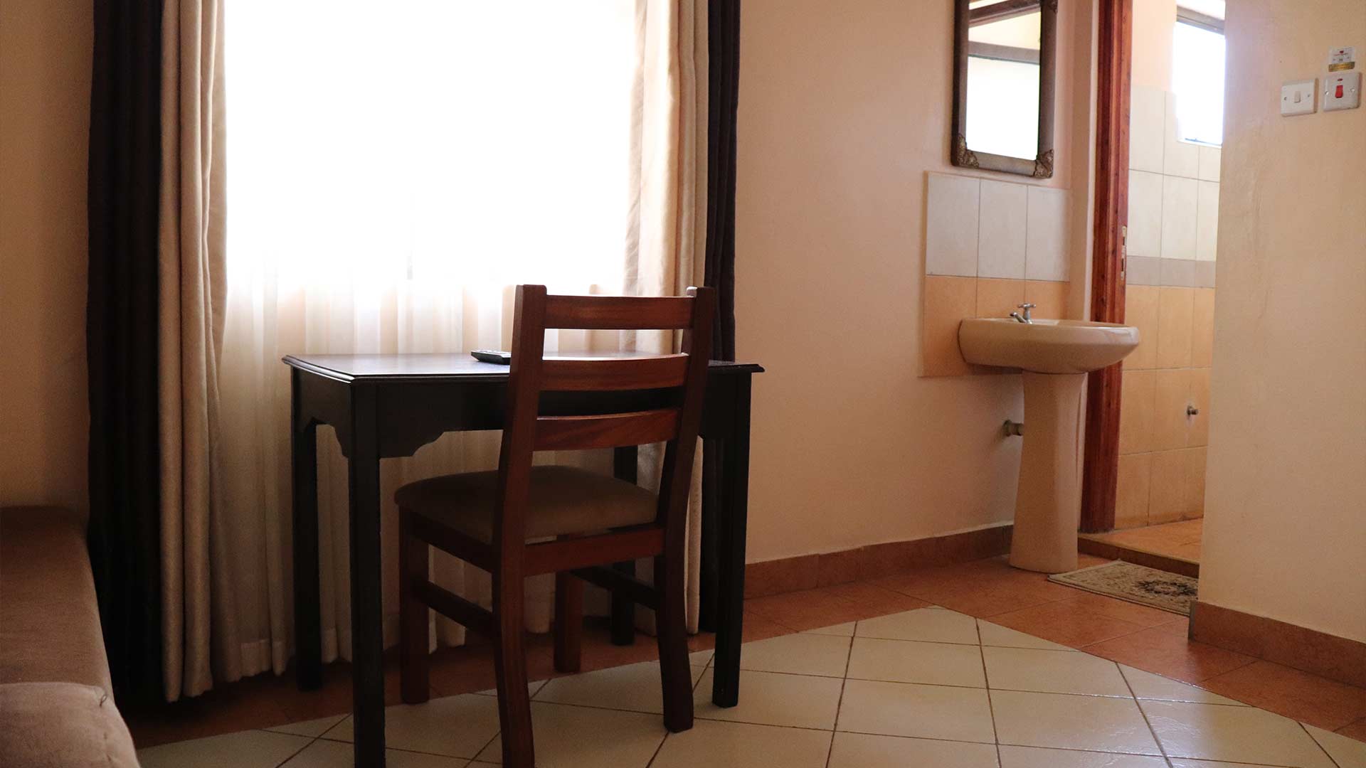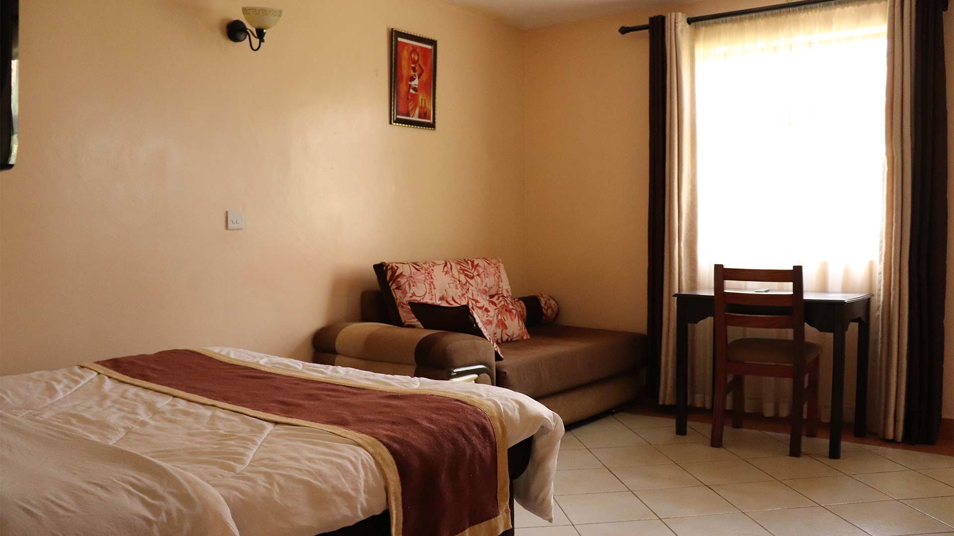 Couples may choose between a luxurious king-size bed or two queen-size beds, both with immaculate, super-soft white linen. Complementary African art scene coupled with a study table setup.